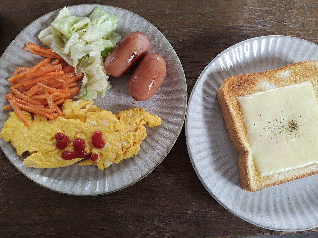 娘が好きな人参ラぺとキャベツを蒸して顆粒コンソメとマヨネーズを和えたもの、そしてウインナーにオムレツにチーズトースト。
