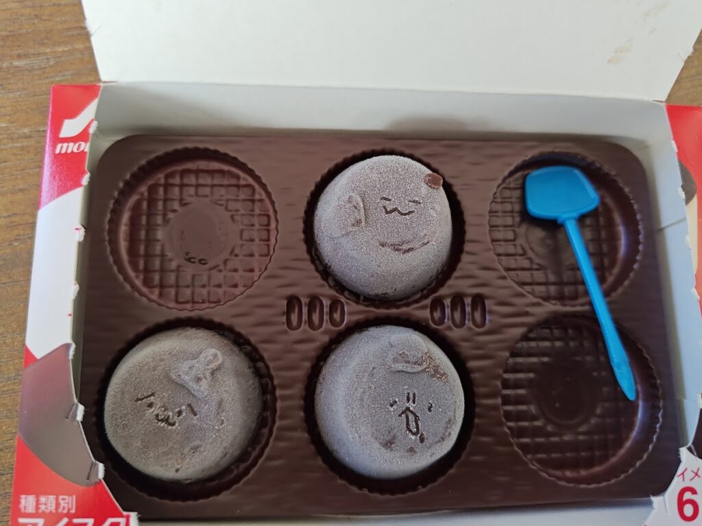 娘と一つのピノを分けっこしたんですが、僕が席を外しているうちにペロリと三つを平らげてしまい、残りの三つに顔を描いていた娘。