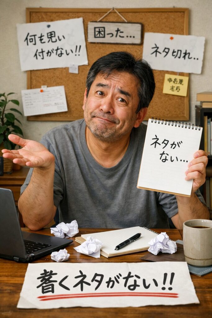 「書くネタが無い事をネタにするオッサン」で画像生成してみましたものがコチラです!